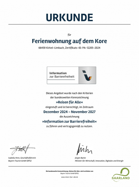 Zertifiziert nach "Reisen für Alle", Auszeichnung "Information zur Barrierefreiheit", Projekt Netzwerk Hören + barrierefreier Tourismus der Tourismus Zentrale Saarland GmbH.